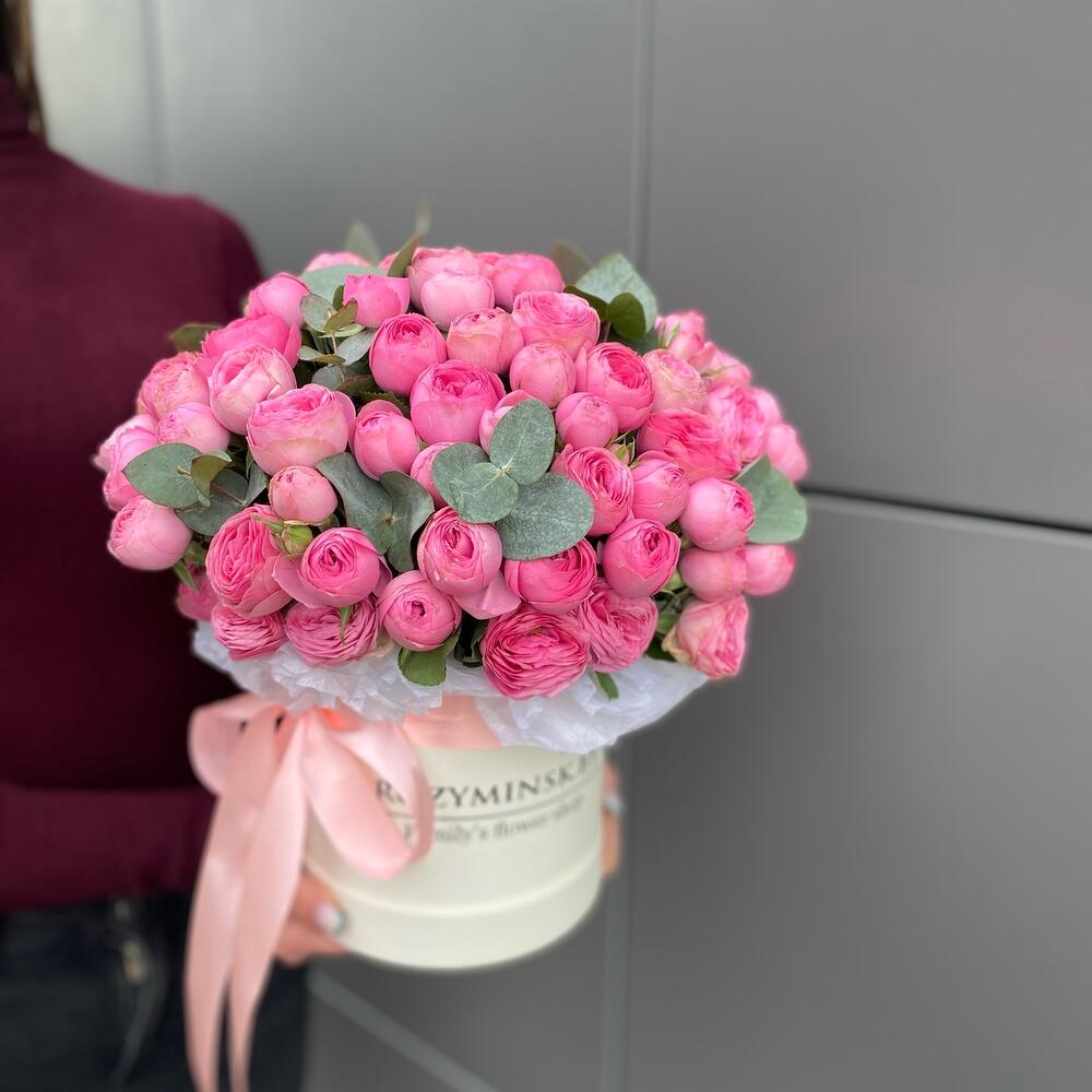 Коробка шляпная – 1 шт. Пионовидная кустовая роза – 11 шт. Губка флористическая – 1 шт.
