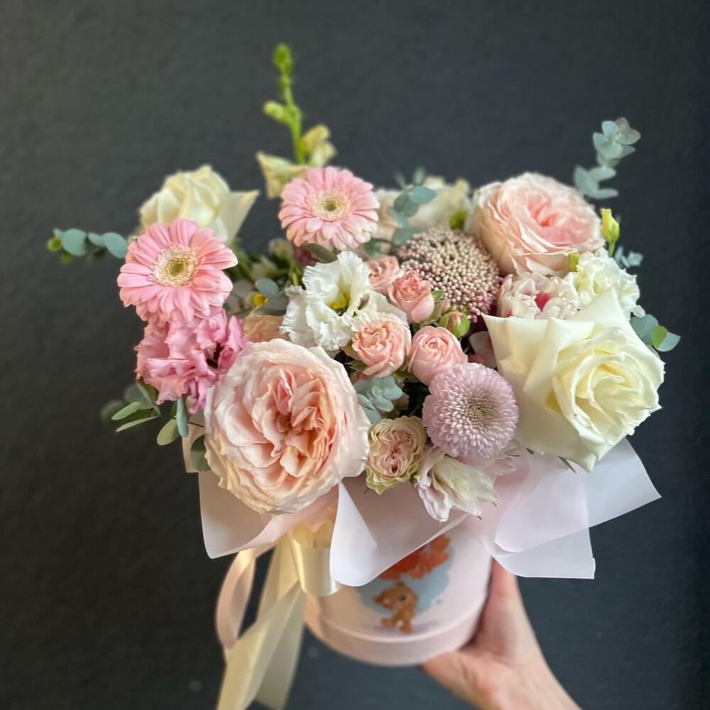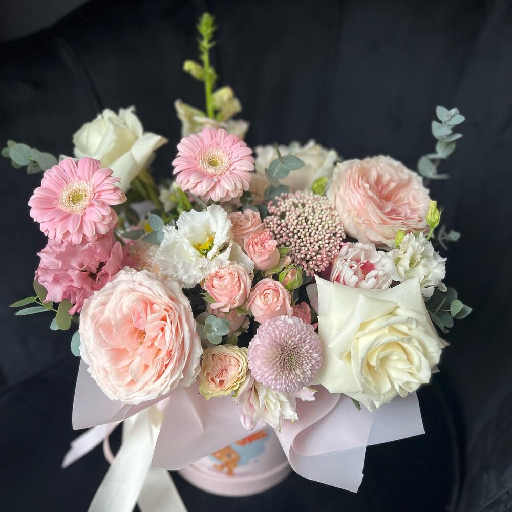 Пионовидная роза – 5 шт.Кустовая роза – 3 шт.Тюльпан пионовидный – 3 шт.Хризантема – 2 шт.Гербера – 3 шт.Лизиантус – 4 шт.Озотамнус – 2 шт.антиринум – 2 шт.Эвкалипт – 3 шт.Шляпная коробка – 1 шт.Флористическая губка (оазис) – 1 шт.Атласная лента – 1 шт.