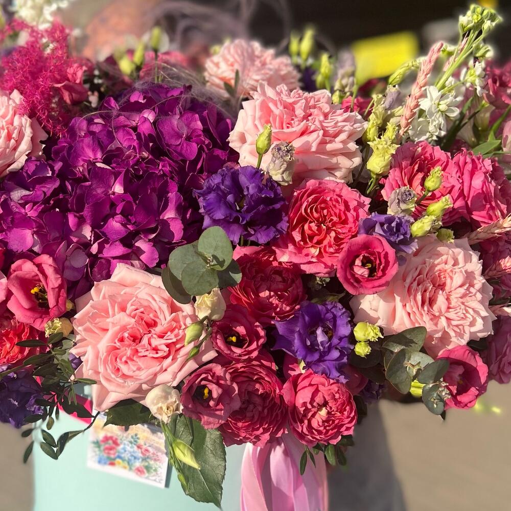 Цветы в коробке с гортензией,пион розами,маттиолой,альстромерией,эустомой,колосьями пшеницы и эвкалиптом