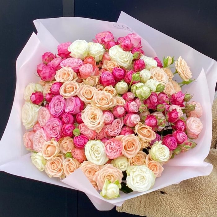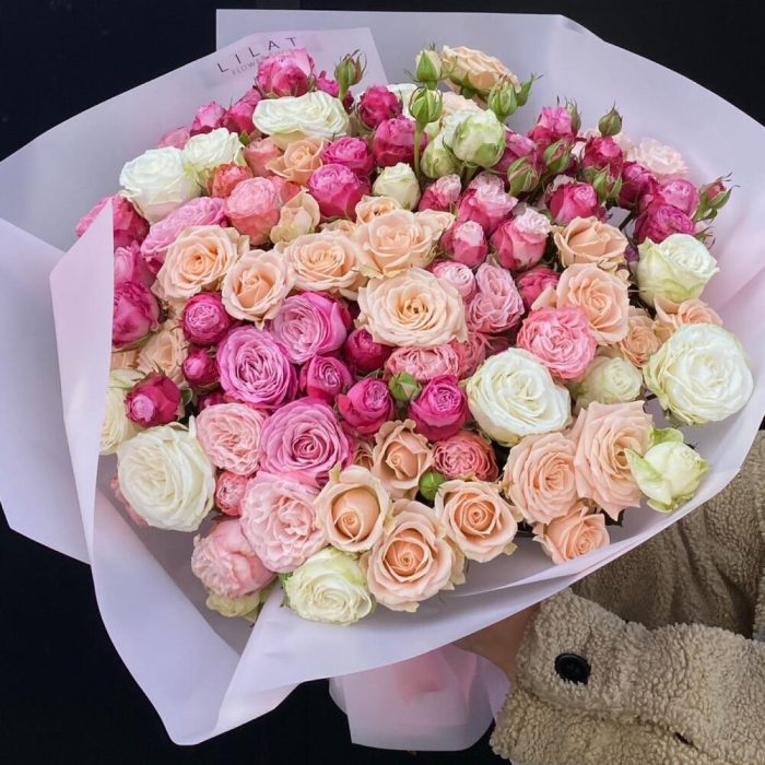 Альстромерии, Гвоздики, Кустовые розы, Лизиантусы, Розы, Хризантемы