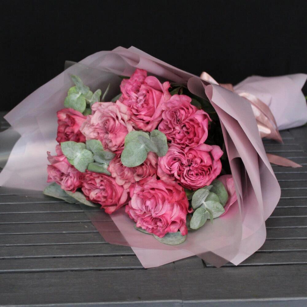 Эвкалипт – 3 шт.Лента атласная – 2 шт.Пленка матовая – 4 шт.роза пионовидная кантри блю – 9 шт.