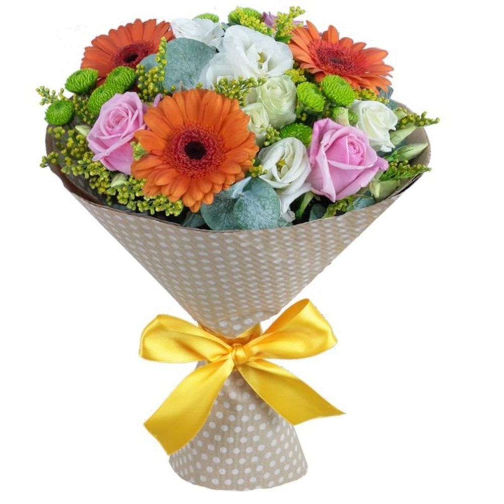 Хризантема сантини зеленая – 3 шт.Листья салал – 1 шт.Солидаго – 2 шт.Корица – 1 шт.лента декоративная – 1 шт.бумага упаковочная – 1 шт.Роза розовая – 3 шт.Эвкалипт – 1 шт.Гербера оранжевая – 3 шт.Лизиантус белый – 2 шт.