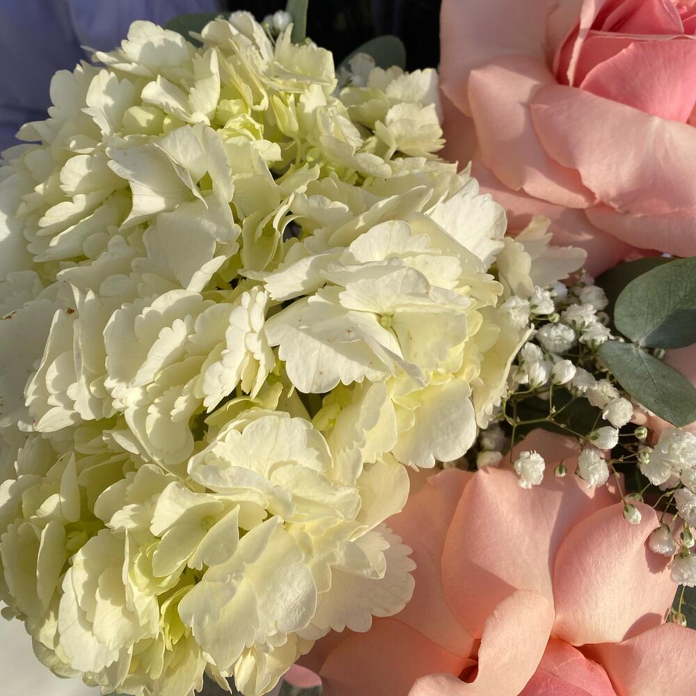 Гипсофила – 2 шт.Гортензия – 1 шт.Тишью – 1 шт.Коробка шляпная – 1 шт.Оазис флористический – 1 шт.Роза pink mondial – 3 шт.