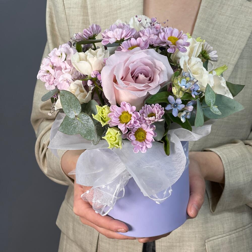 Лента – 1 шт.Маттиола – 1 шт.Роза кустовая – 2 шт.Эвкалипт – 1 шт.Роза одноголовая – 1 шт.Гвоздика – 1 шт.Коробка шляпная – 1 шт.Сантини – 1 шт.Оксипеталум – 2 шт.