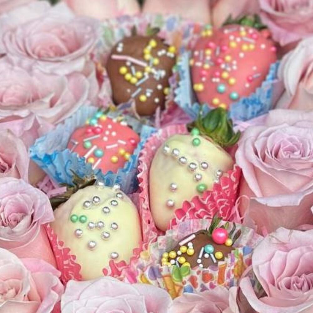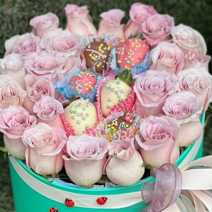 Вкуснейшая клубника в шоколаде в сочетании с нежными розами станут изысканным подарком для ваших близких