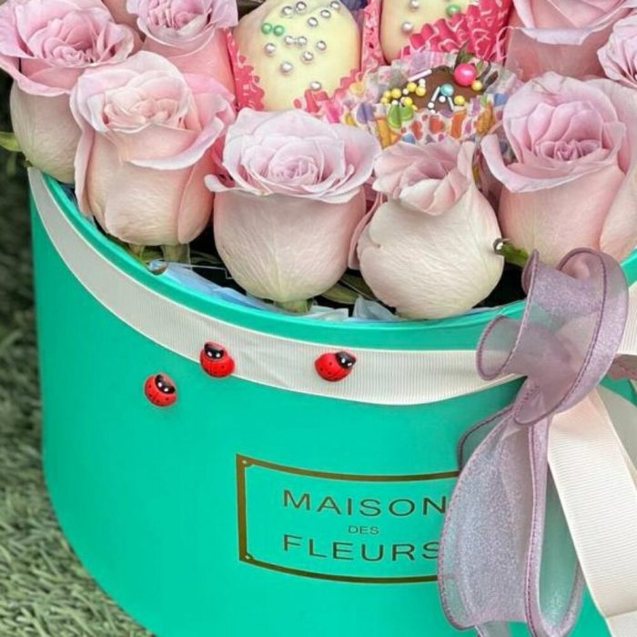 Роза голландия – 23 шт. Клубника в шоколаде – 6 шт. Шляпная коробка – 1 шт. Оазис флористический – 2 шт. Лента атласная – 2 шт.