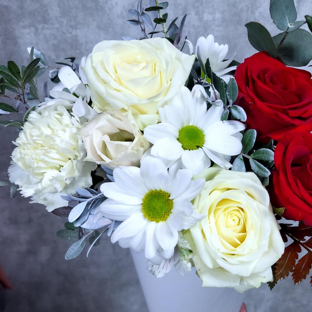 Хризантема кустовая – 1 шт.Роза – 5 шт.Гвоздика – 1 шт.Фисташка – 1 шт.Шляпная коробка – 1 шт.Оазис флористический – 1 шт.