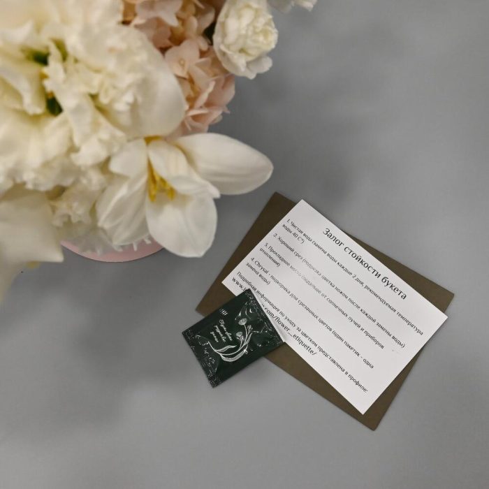 - Сроки возврата: Претензии по качеству букета принимаются в течение 24 часов с момента его получения.