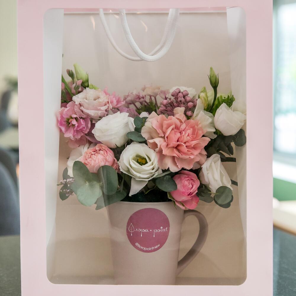 Лизиантус – 2 шт.Маттиола – 1 шт.Роза кустовая – 1 шт.Зелень – 1 шт.Гвоздика – 2 шт.Оазис – 1 шт.Бувардия – 1 шт.Пакет подарочный – 1 шт.Кружка – 1 шт.