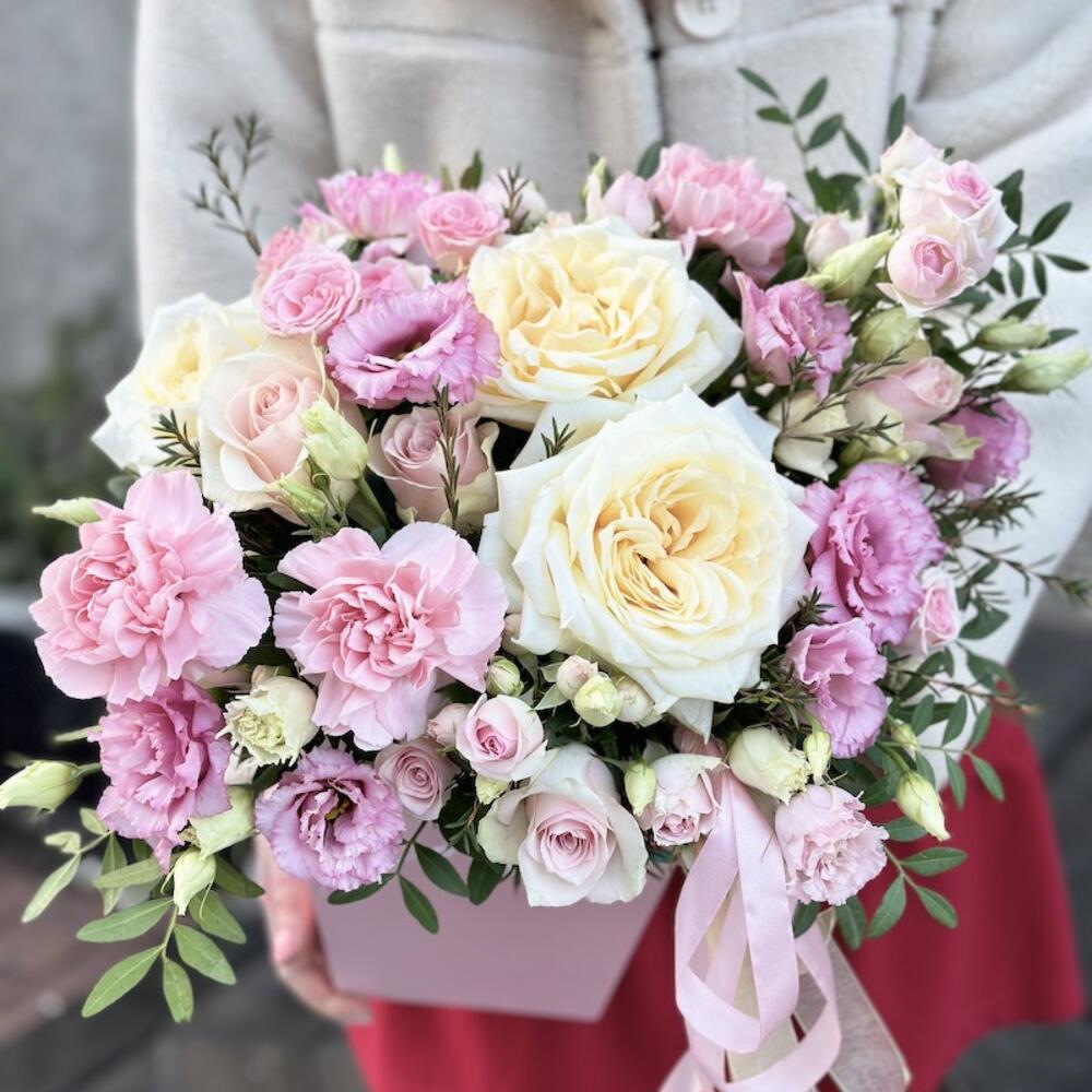 Роза пионовидная – 2 шт.Роза – 5 шт.лизиантус розовый алиса – 4 шт.Роза кустовая – 2 шт.Диантус – 5 шт.декоративная зелень – 5 шт.Коробка – 1 шт.Флористическая губка – 1 шт.Бант – 1 шт.