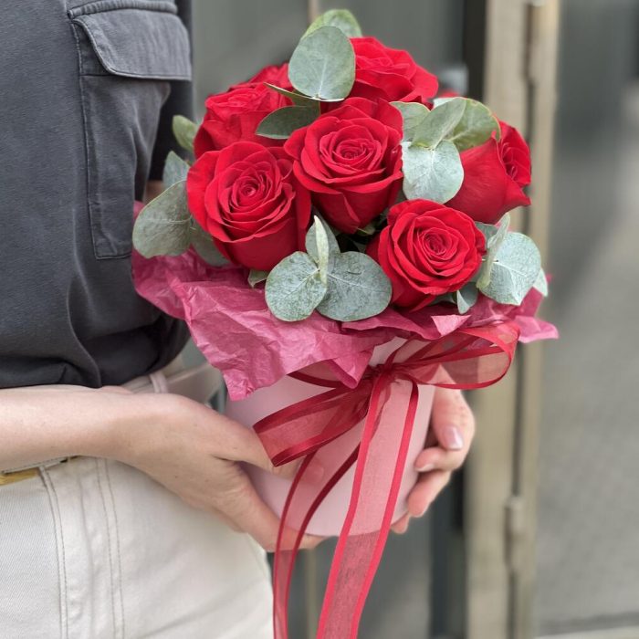 Коробка Жаккард из 9 красных роз и эвкалипта