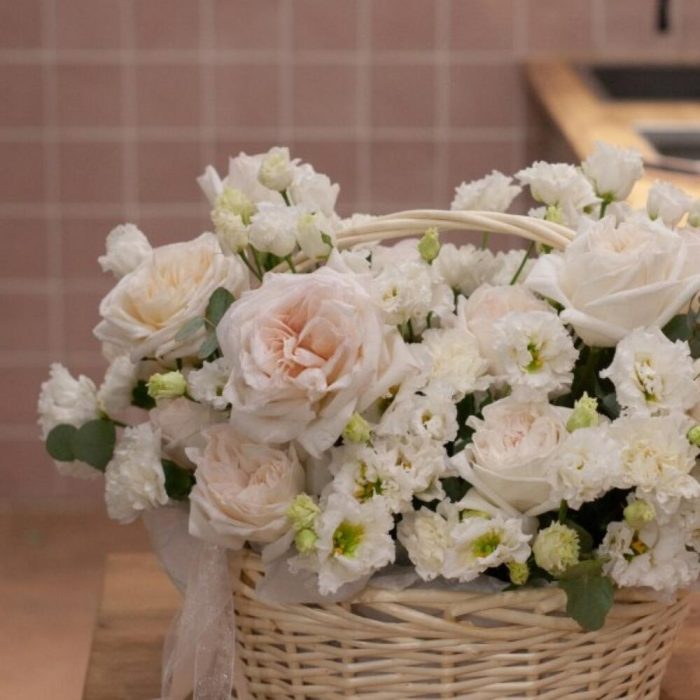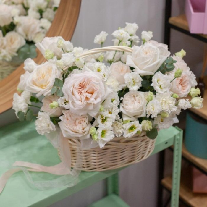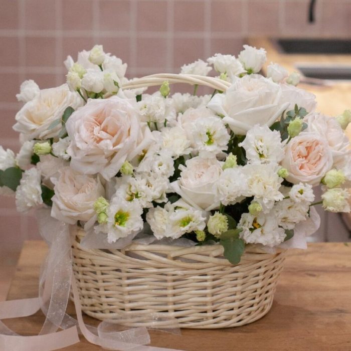 Пионовидная роза – 14 шт.Лизиантус – 7 шт.Диантус – 12 шт.Эвкалипт – 10 шт.Корзина плетеная – 1 шт.