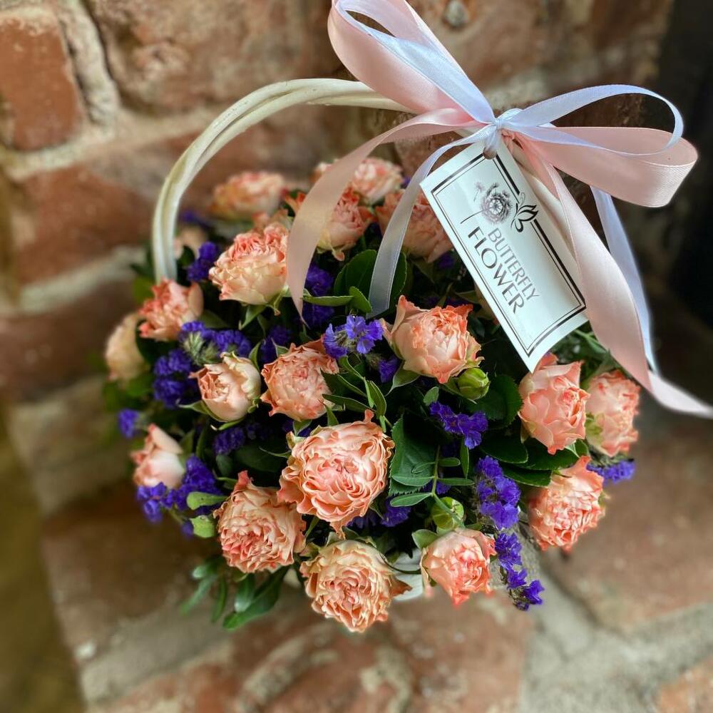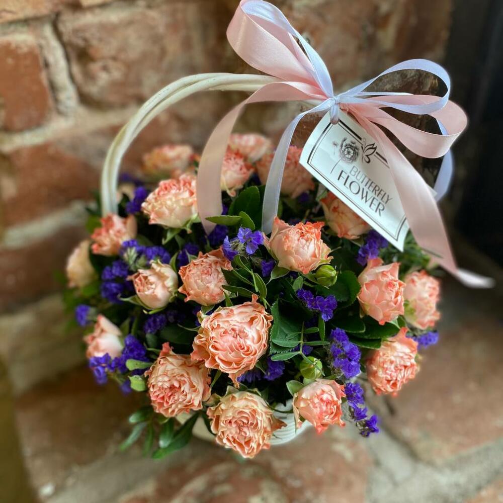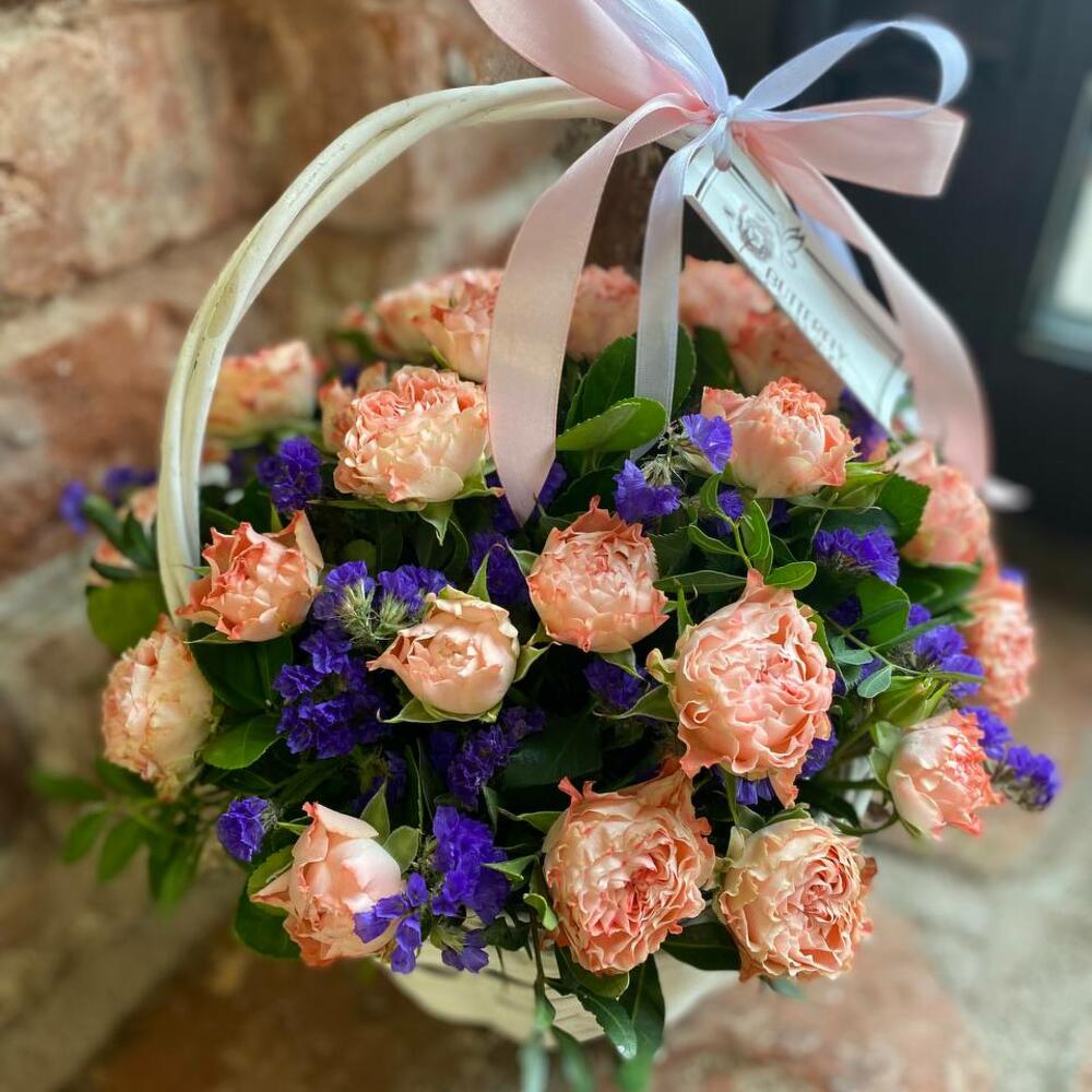 Корзина с кустовыми розами и статицей "Васильковый рассвет"