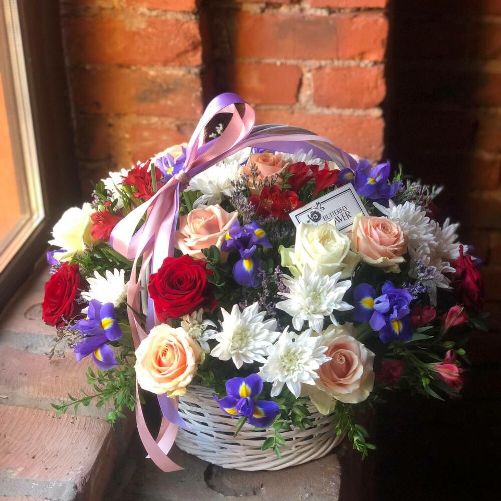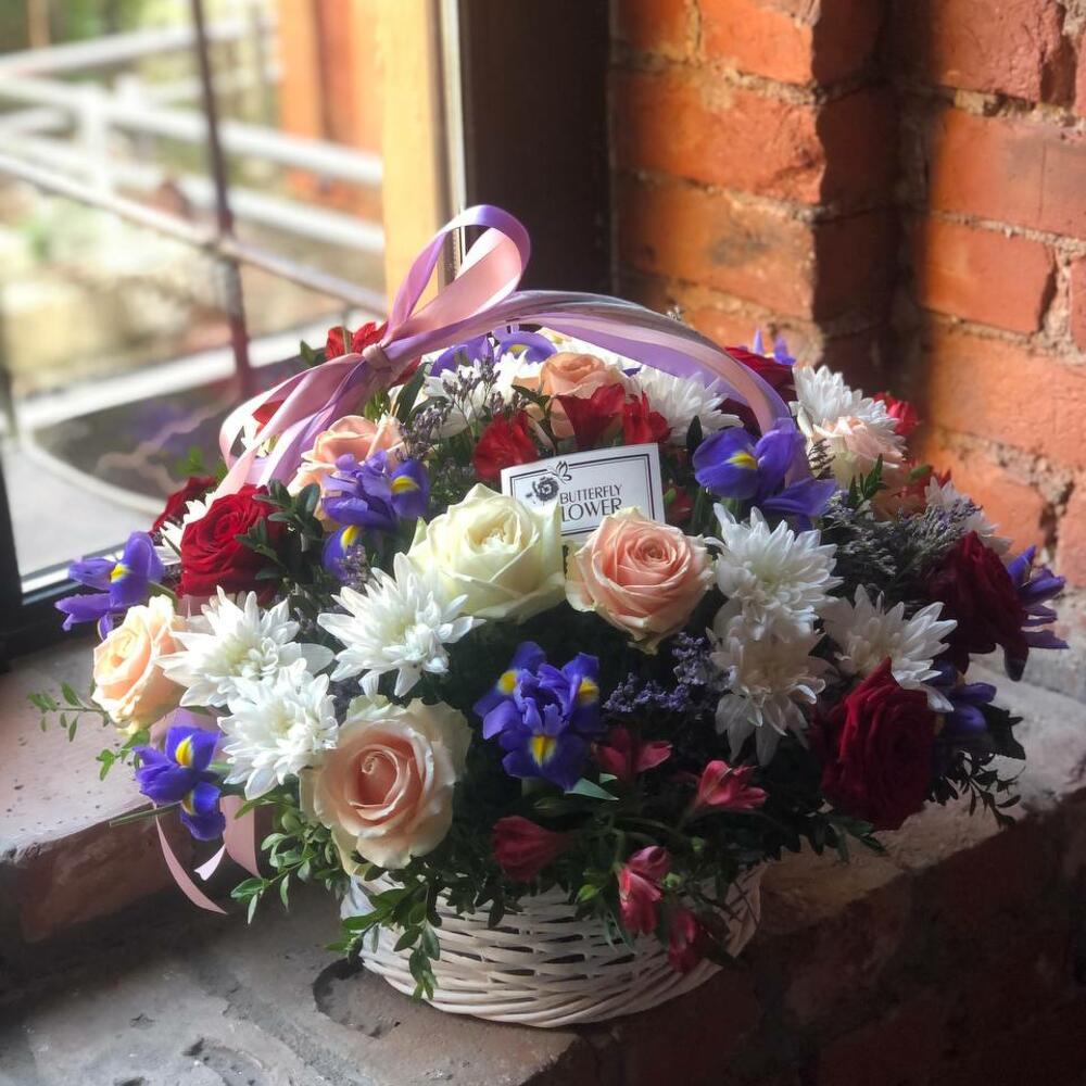 Корзина с розами, ирисами, кустовой хризантемой, альстромерией и лимониумом “Виноградная лоза”