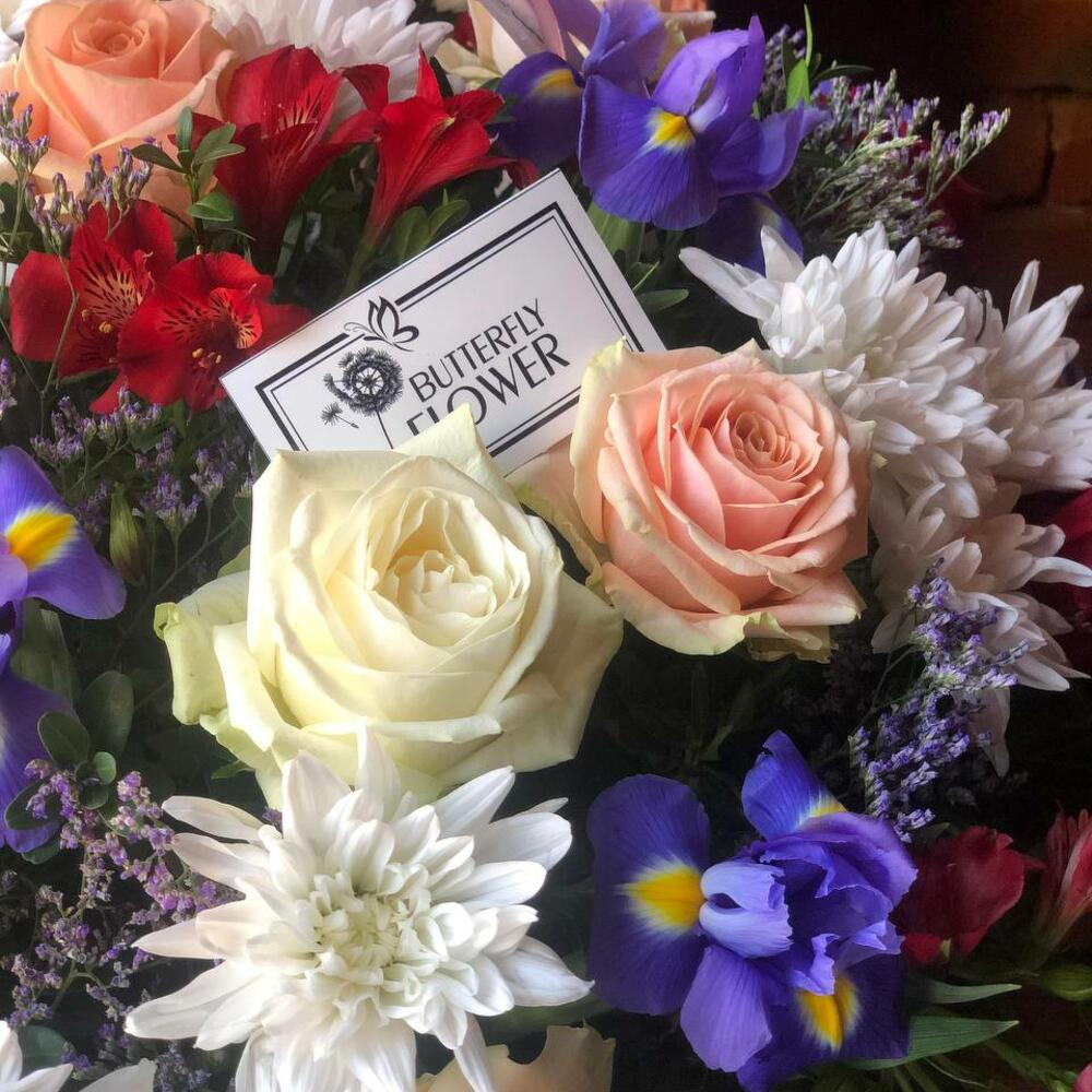Категорий: Альстромерии, Ирисы, Кустовые розы, Розы, Хризантемы