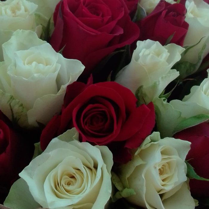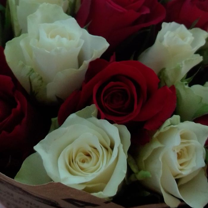 Роза красная – 16 шт.Роза белая – 15 шт.Крафт упаковка – 1 шт.