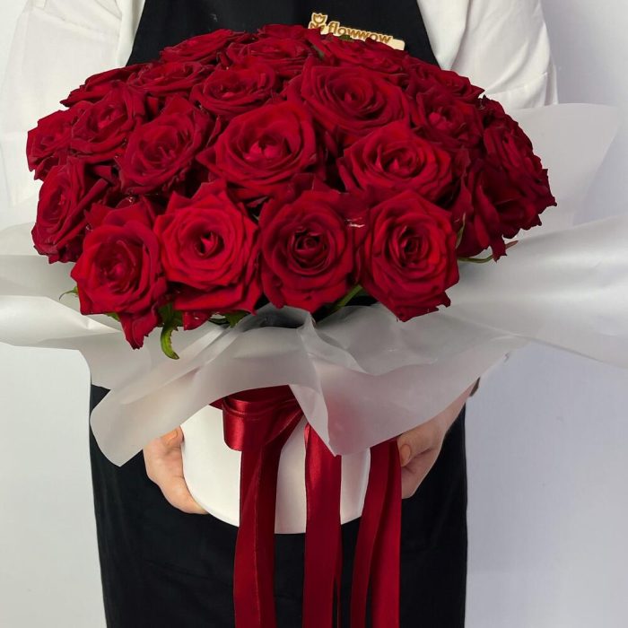 Оазис флористический – 1 шт.Коробка белая – 1 шт.красные розы – 27 шт.