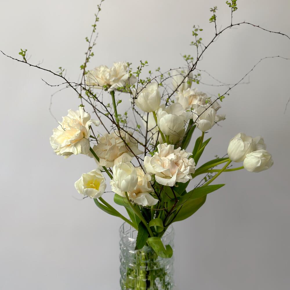 Пионовидная роза – 7 шт.белые тюльпаны – 10 шт.Спирея – 2 шт.