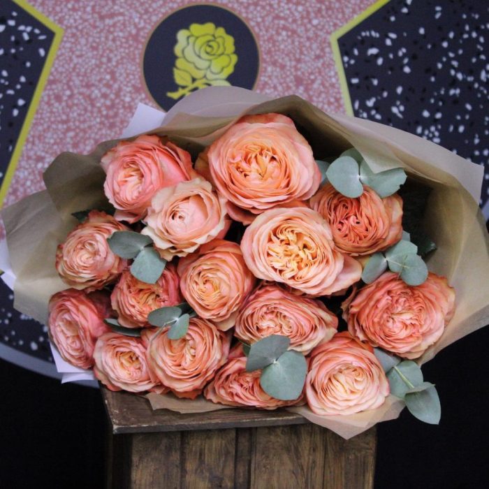 Роза пионовидная – 15 шт.Эвкалипт – 3 шт.Пленка дизайнерская – 3 шт.