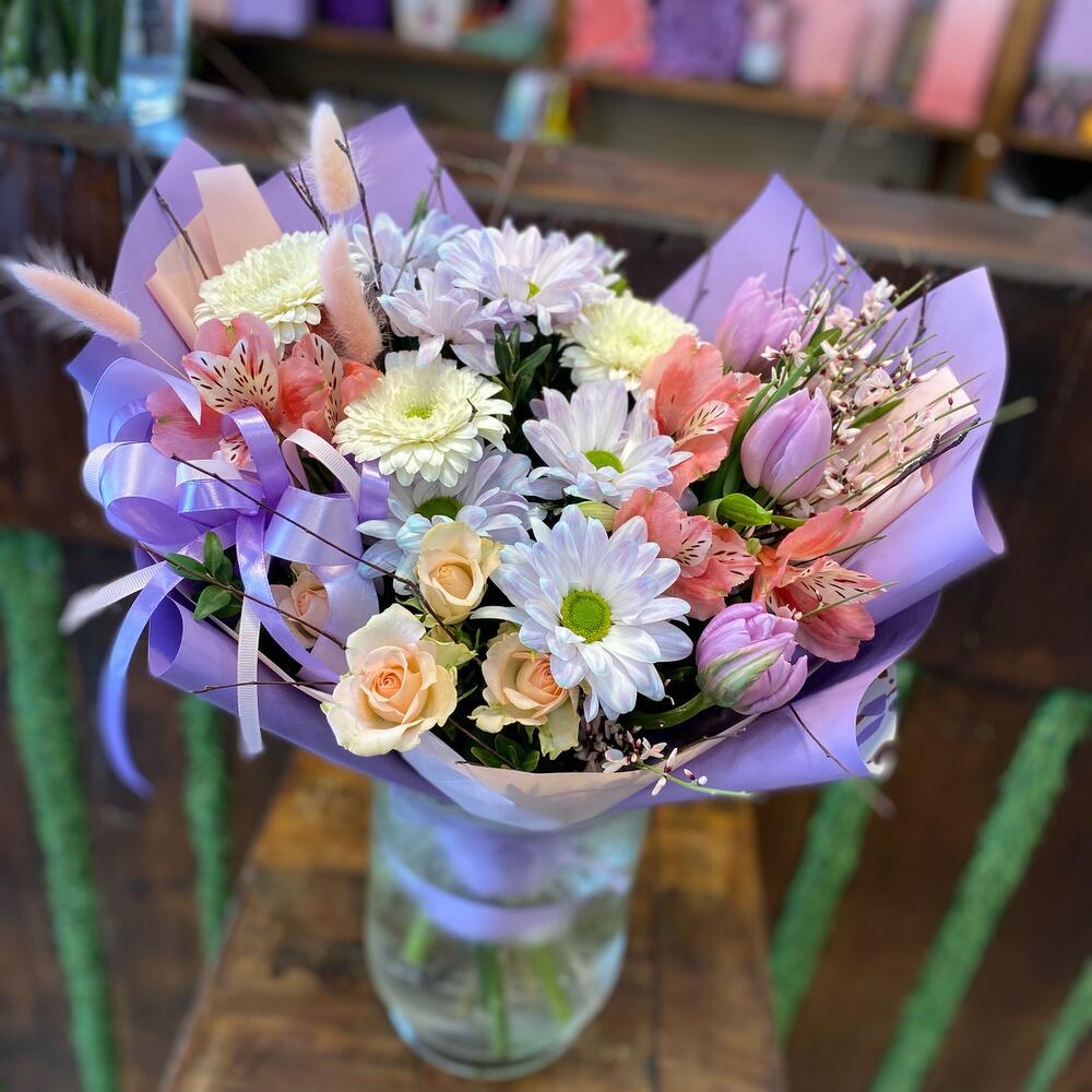 Альстромерия – 3 шт.Роза кустовая – 1 шт.Хризантема кустовая – 2 шт.Гербера мини – 3 шт.Тюльпан пионовидный – 3 шт.Упаковка дизайнерская – 1 шт.