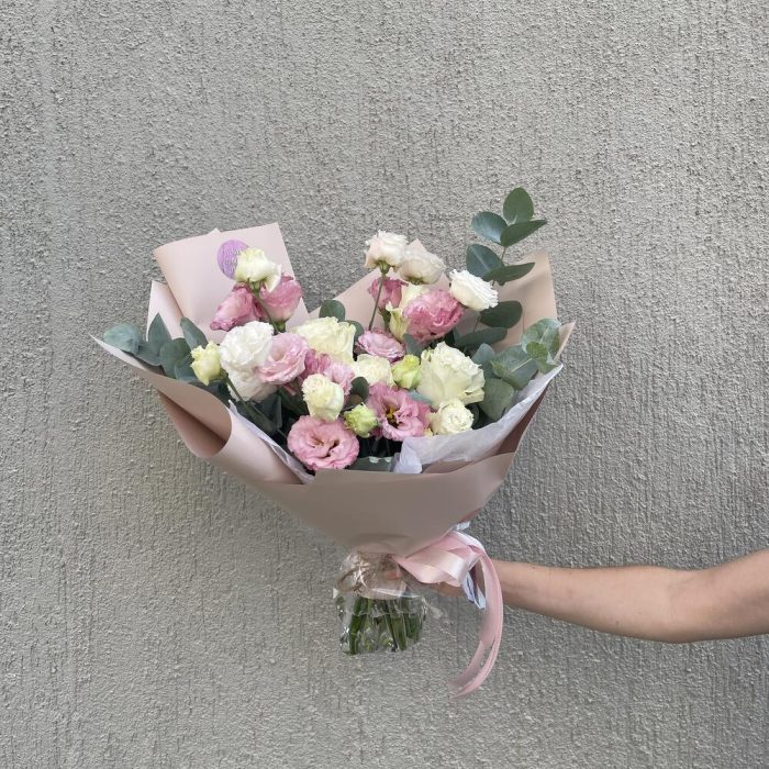 В этом букете сочетаются изящная эустома и нежная роза, что создает прекрасное сочетание цветов и текстур. Каждый цветок в букете подобран внимательно, только самые свежие и качественные цветы используются для создания этого букета.