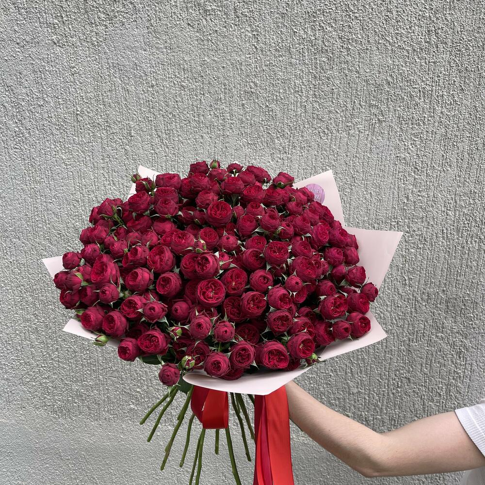 Роза кустовая – 29 шт. Упаковка – 1 шт. Атласная лента – 1 шт.