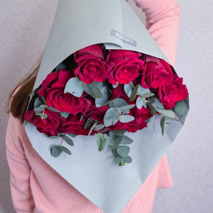 Монобукет из красных роз и эвкалипта
