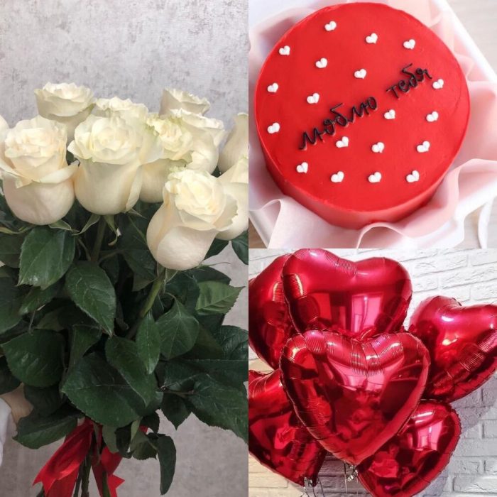 Шары гелиевые – 7 шт. розы белые – 11 шт. бенто торт – 1 шт.
