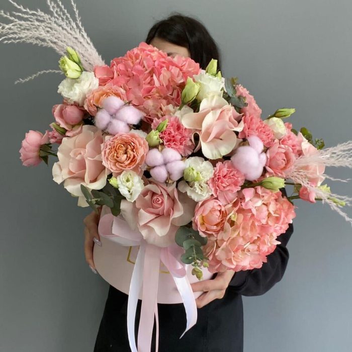 “Атлас☁️” – цветочная композиция с зефиром в деревянном ящике
