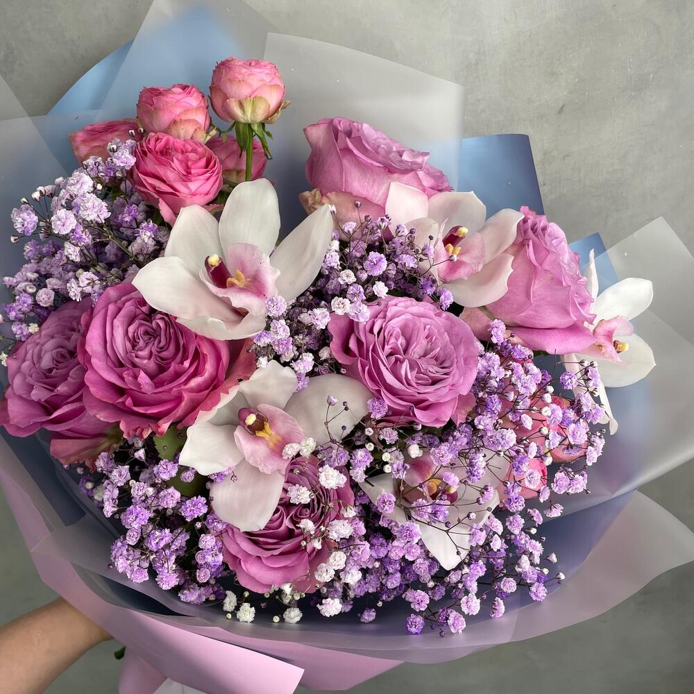 Гипсофила – 5 шт.Орхидея Цимбидиум – 5 шт.Роза кустовая – 2 шт.Упаковка дизайнерская – 1 шт.роза квинс краун – 6 шт.