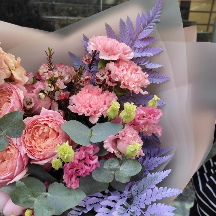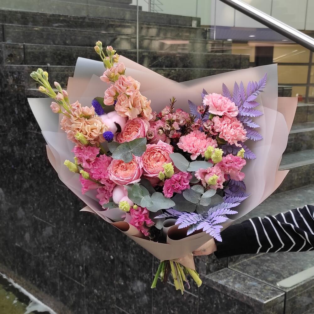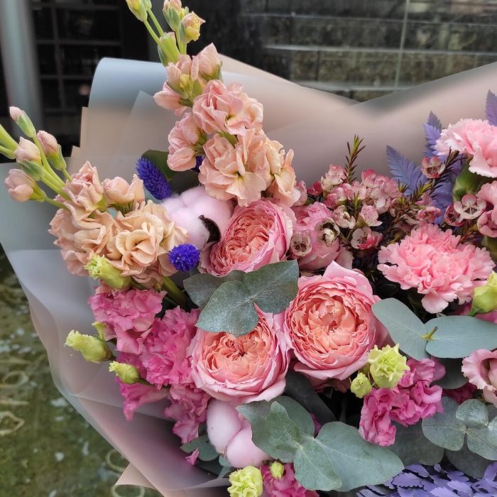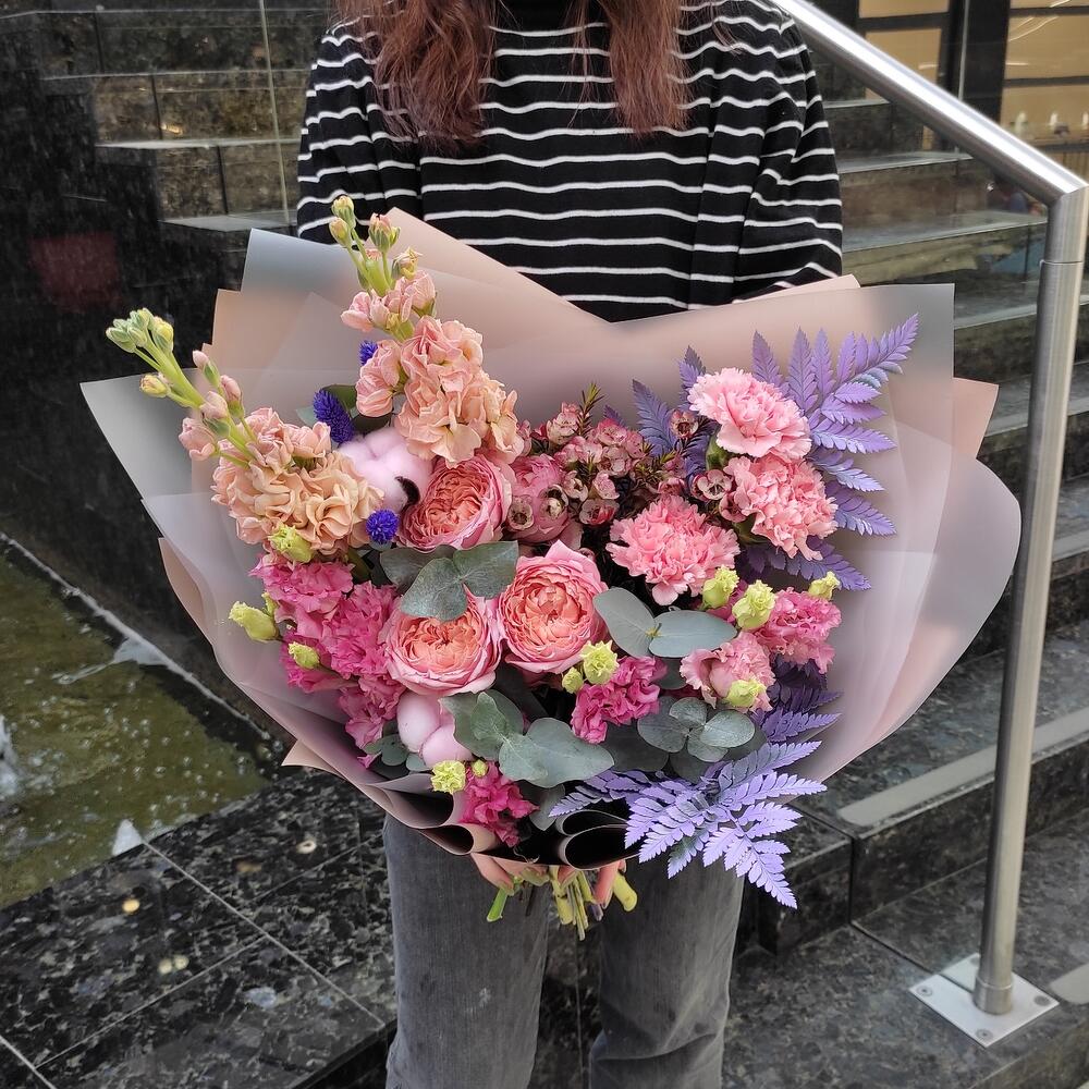 Хлопок – 3 шт.папоротник крашенный – 3 шт.Маттиола – 2 шт.Ваксфлауэр – 1 шт.Роза пионовидная – 1 шт.Эустома – 3 шт.Упаковка дизайнерская – 3 шт.