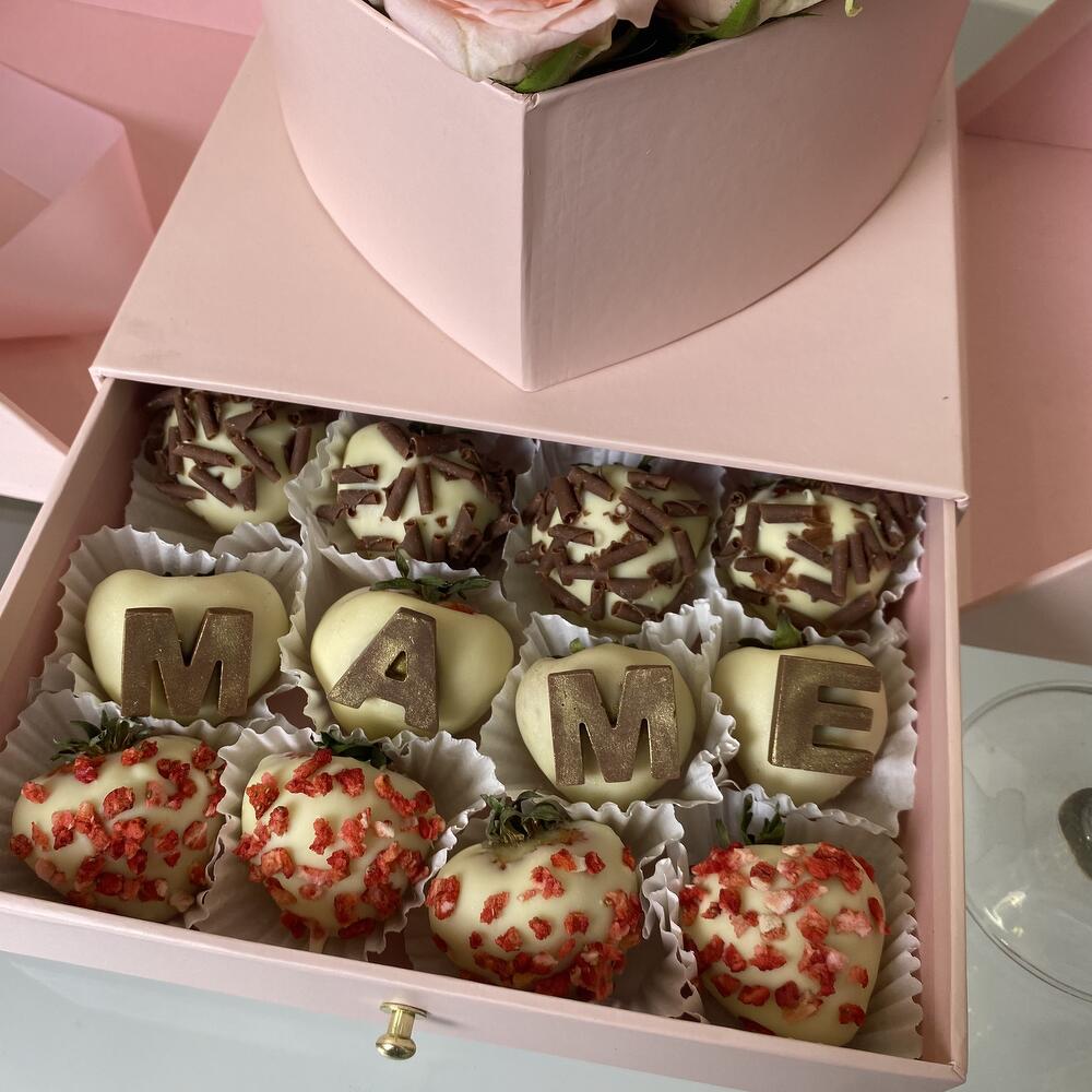 Подарочный набор “МАМЕ” в шкатулке с цветами и клубникой в шоколаде