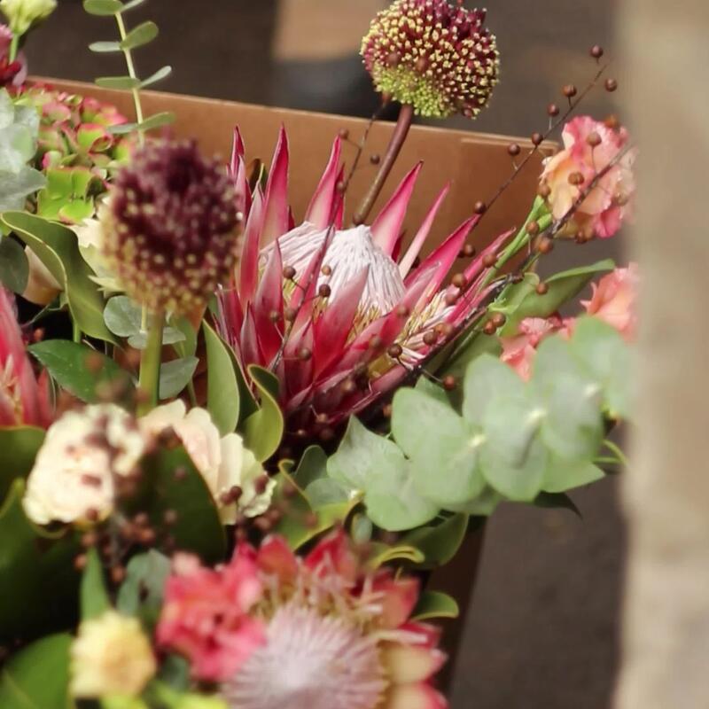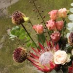 Авторский осенний букет с протеями, пионовидными розами, лизиантусом, ветками льна, аллиумом, листьями магнолии и эвкалиптом.