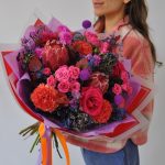 Очень яркий!Необычное сочетание экзотики и классики – протея, колючки, розы и гвоздики.Необычный букет для вашего получателя!Станет прекрасным подарком на день рождения, юбилей. Яркие краски как никогда лучше подходят для дарения в это время года)