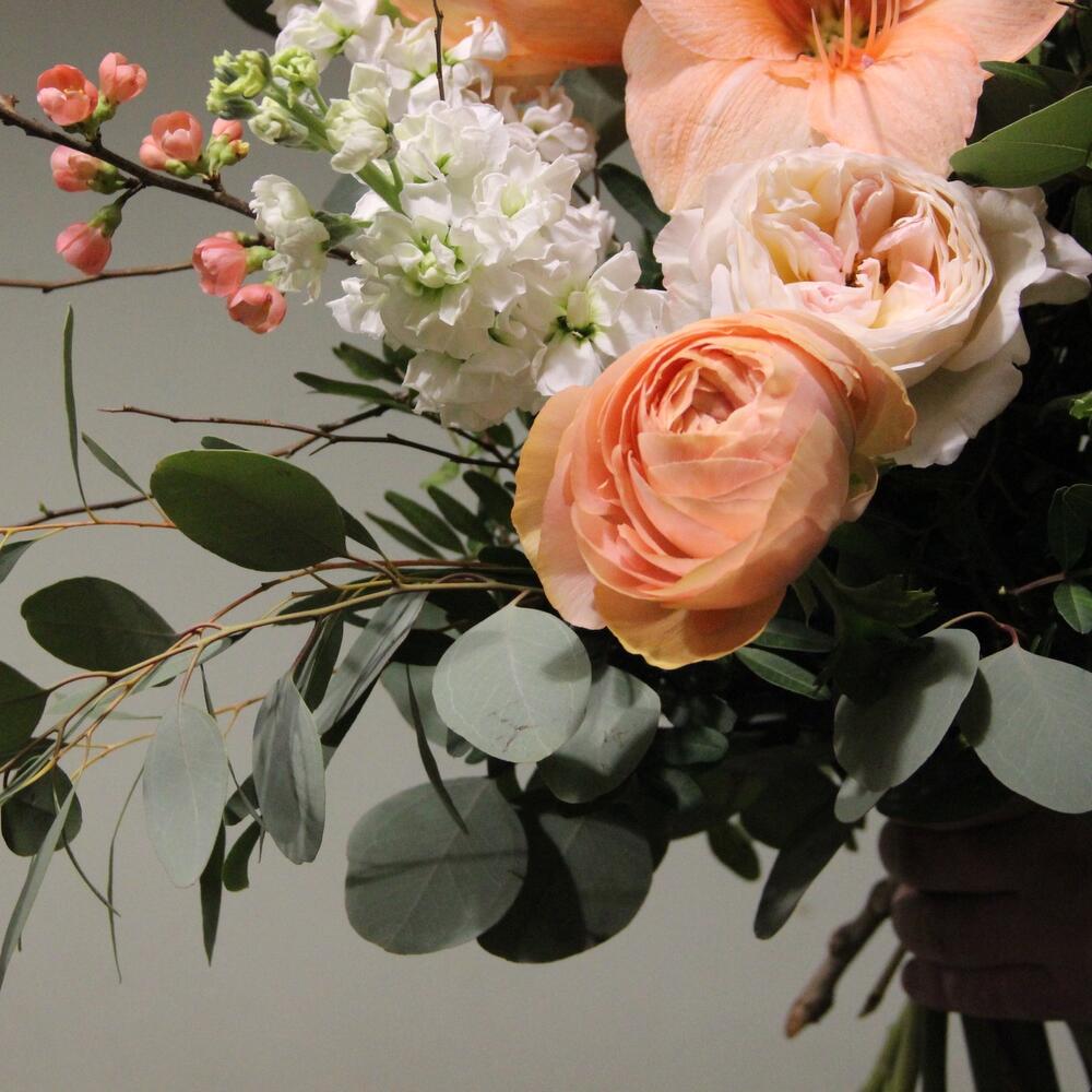 Букет с ранункулюсами, амариллисом, пионовидными розами, эвкалиптом и маттиолой.