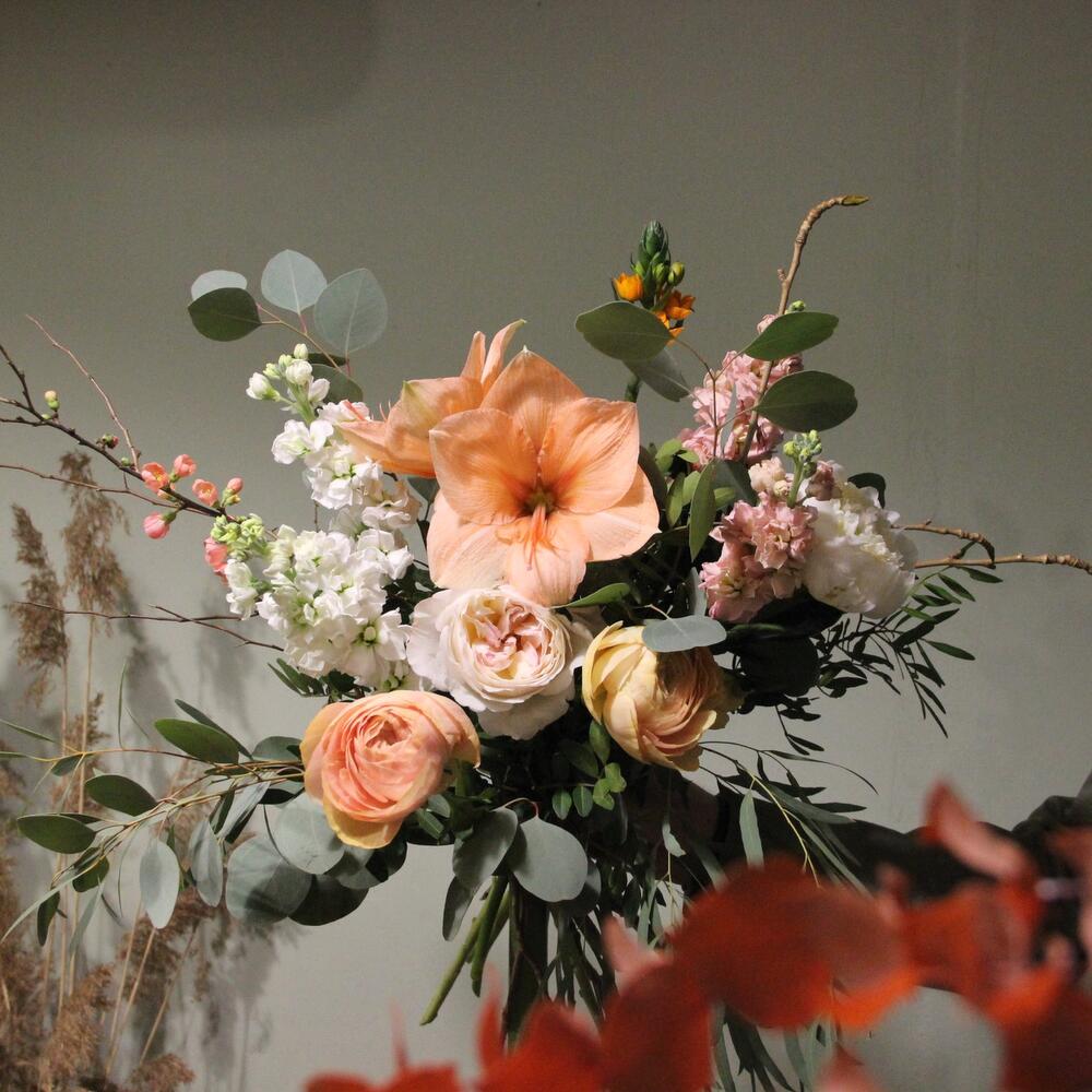 Амариллис – 1 шт.Орнитогалум – 1 шт.Маттиола – 6 шт.Пион – 1 шт.Ранункулюс – 2 шт.Роза пионовидная – 1 шт.Эвкалипт – 5 шт.ветки тополя – 1 шт.