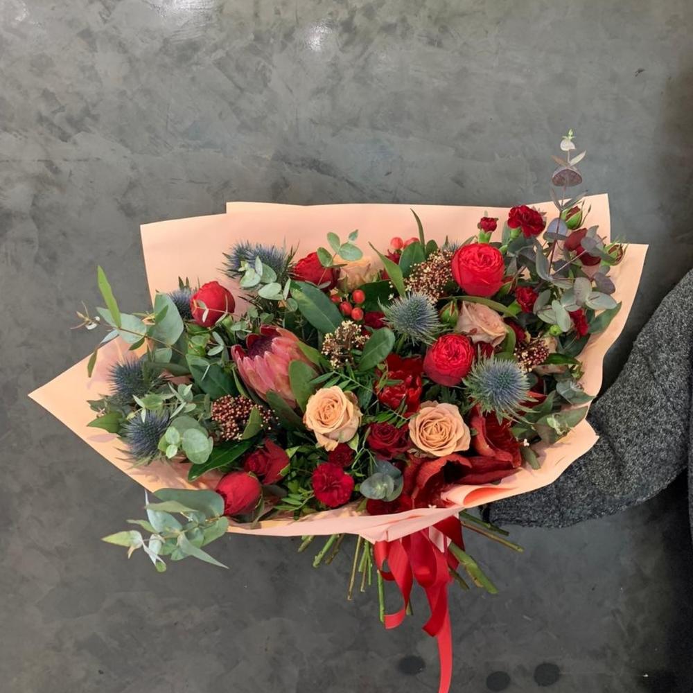 Роза – 7 шт.Роза кустовая – 5 шт.Протея – 1 шт.Гиперикум – 5 шт.Скиммия – 5 шт.Эрингиум – 4 шт.Эвкалипт – 5 шт.Лента атласная – 3 шт.Упаковка дизайнерская – 5 шт.