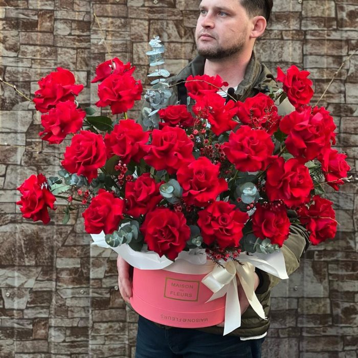 Эвкалипт – 5 шт. Лента атласная – 2 шт. Коробка шляпная – 1 шт. Фисташка – 2 шт. Хамелациум – 5 шт. Роза голландия – 25 шт. Декор – 2 шт. Оазис флористический – 2 шт.