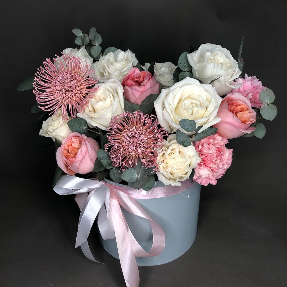 Огромная коробка с пионовидными розами и тропическими леукоспермумами. Когда хочется подарить не банальные розы