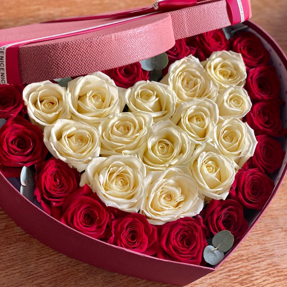 Эвкалипт – 1 шт.Оазис флористический – 1 шт.Роза red naomi – 17 шт.Коробка сердце большая – 1 шт.Роза аваланж россия – 14 шт.