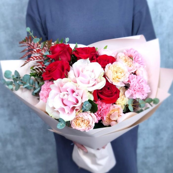 Гвоздики, Лизиантусы, Розы, Тюльпаны