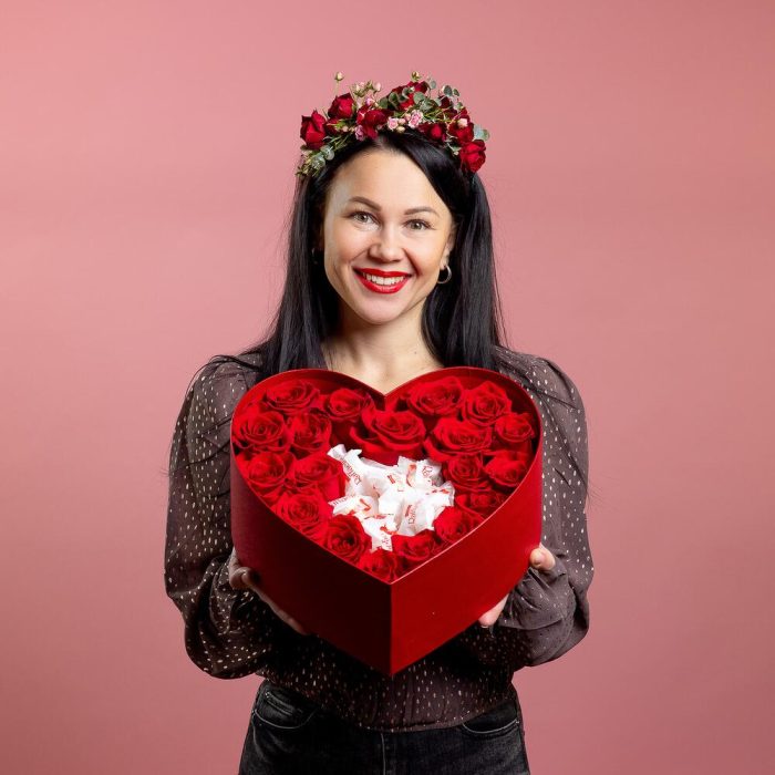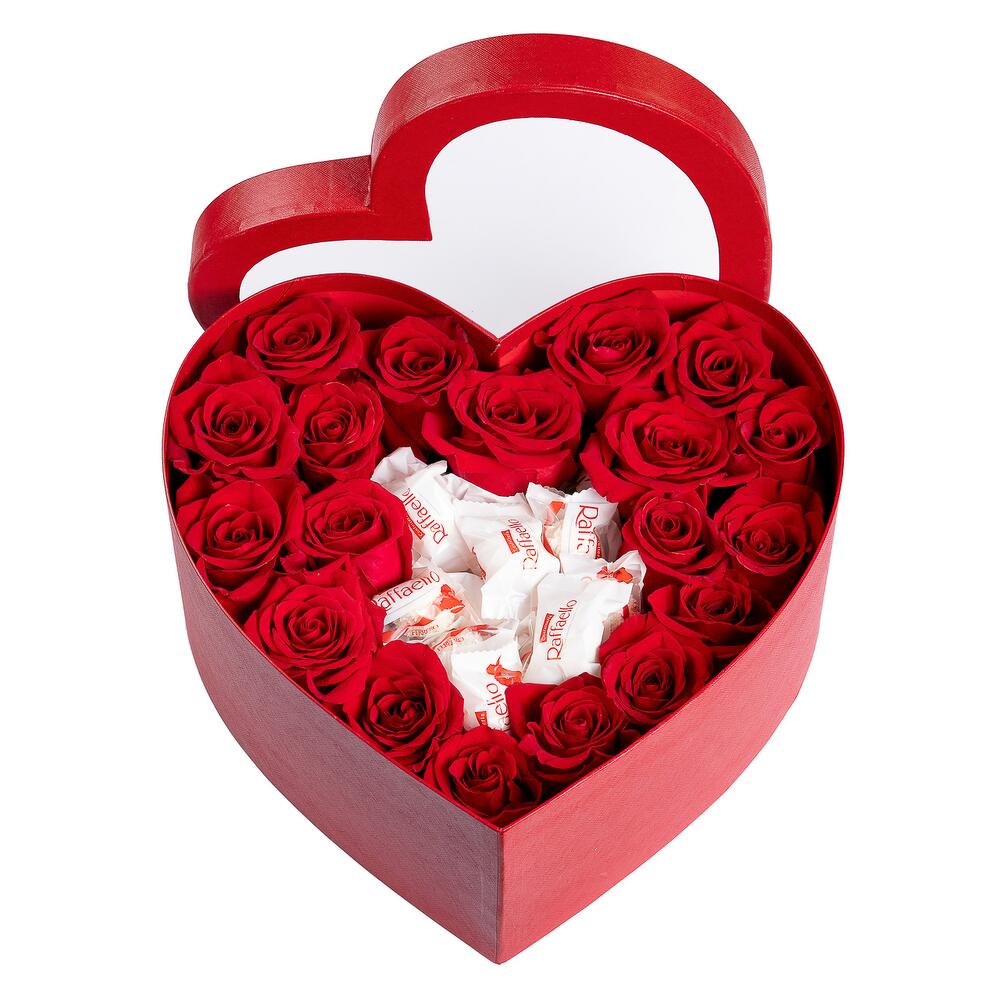 “Сладкое сердце ” – цветочная композиция с сладостями в коробке “Сердце”