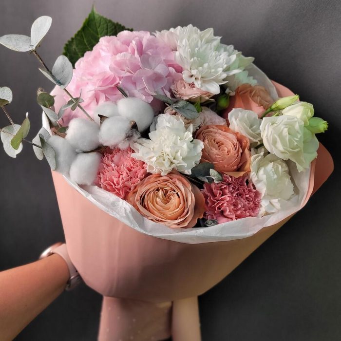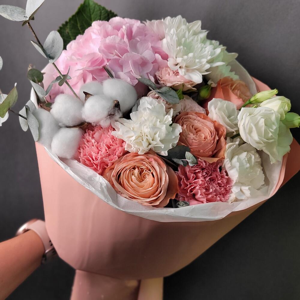 Гортензия – 1 шт.Роза кустовая – 1 шт.Хлопок – 1 шт.Хризантема кустовая – 1 шт.Эвкалипт – 1 шт.Роза Эквадор – 3 шт.Эустома – 1 шт.Лента атласная – 1 шт.Диантус – 4 шт.Упаковка дизайнерская – 1 шт.