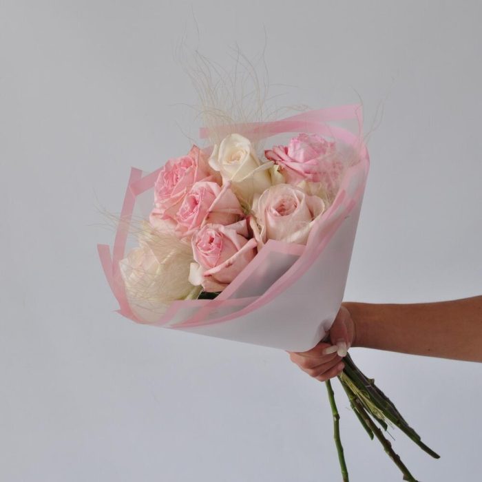 Лента атласная – 1 шт.Упаковка дизайнерская – 1 шт.Ковыль – 3 шт.роза охара пионовидная – 7 шт.