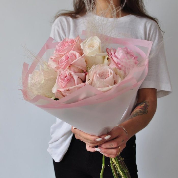 Шикарный букет мраморной кустовой розы 51 шт