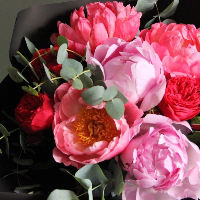 Пион – 5 шт.Эвкалипт – 3 шт.Роза пионовидная кустовая – 4 шт.Упаковка дизайнерская – 3 шт.шнур декоративный – 1 шт.