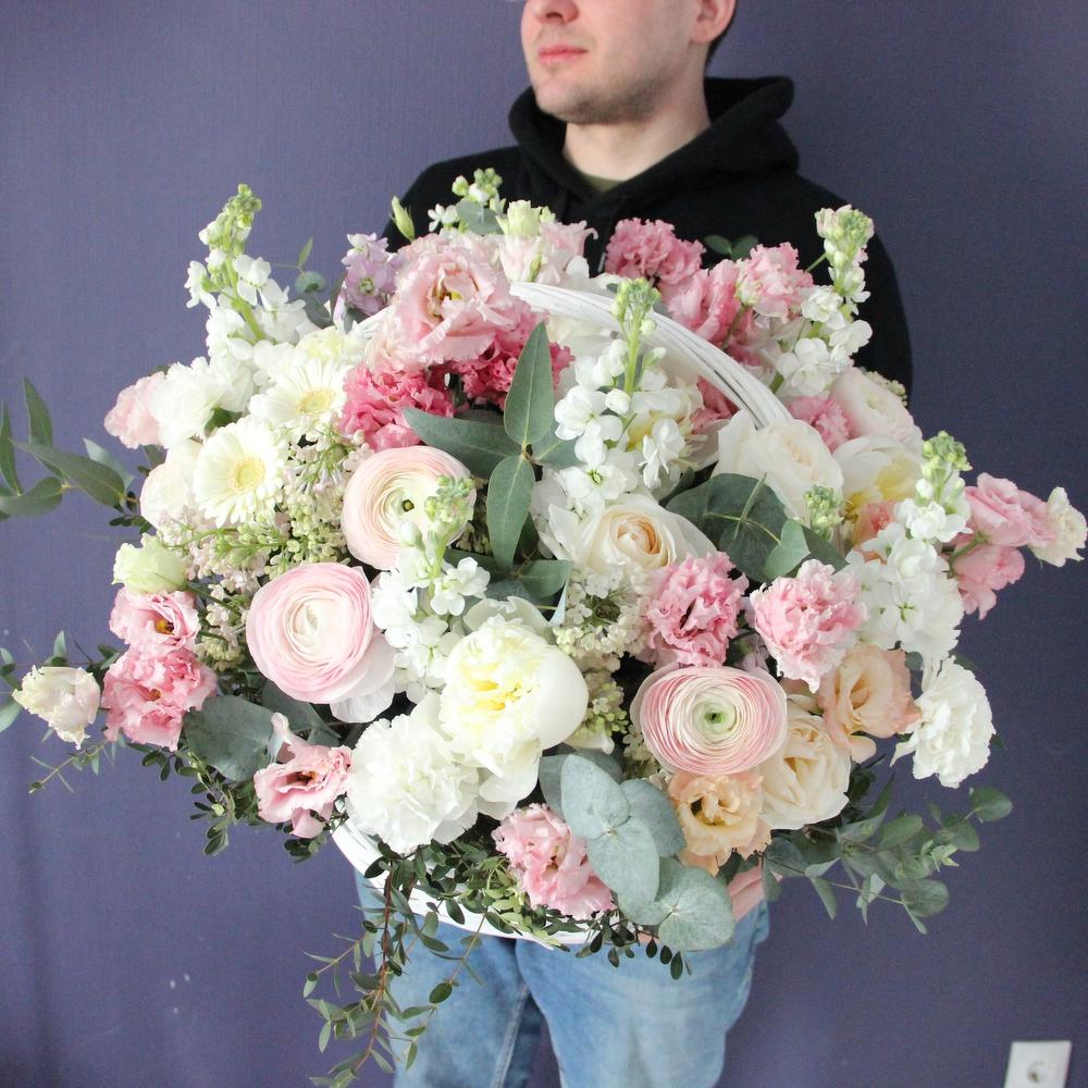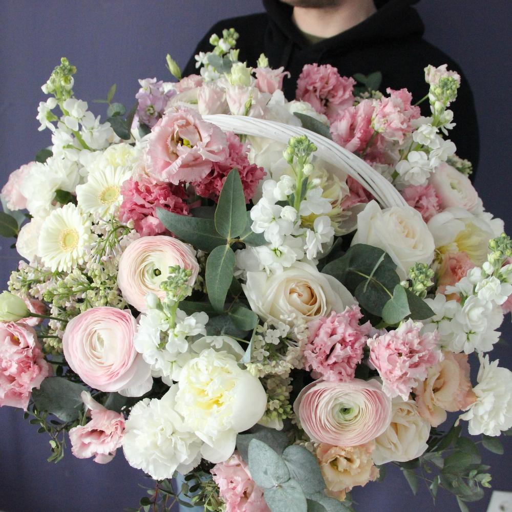 Пион – 5 шт.Роза пионовидная – 9 шт.Гербера – 7 шт.Диантус – 10 шт.Маттиола белая – 5 шт.Лизиантус – 7 шт.Эвкалипт – 11 шт.Ранункулюс – 7 шт.Сирень – 5 шт.Корзина – 1 шт.
