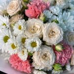 роза кустовая таня – 3 шт.Диантус сортовой – 5 шт.Хризантема кустовая белая – 3 шт.Сантини белая – 5 шт.Упаковка дизайнерская – 1 шт.