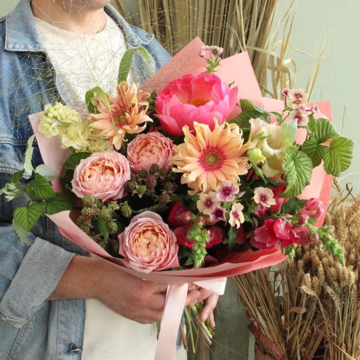 Авторский букет с ежевикой, пионами, душистой маттиолой, флоксами, львиным зевом, садовыми розами, кучерявыми герберами, ветками малины и травами.