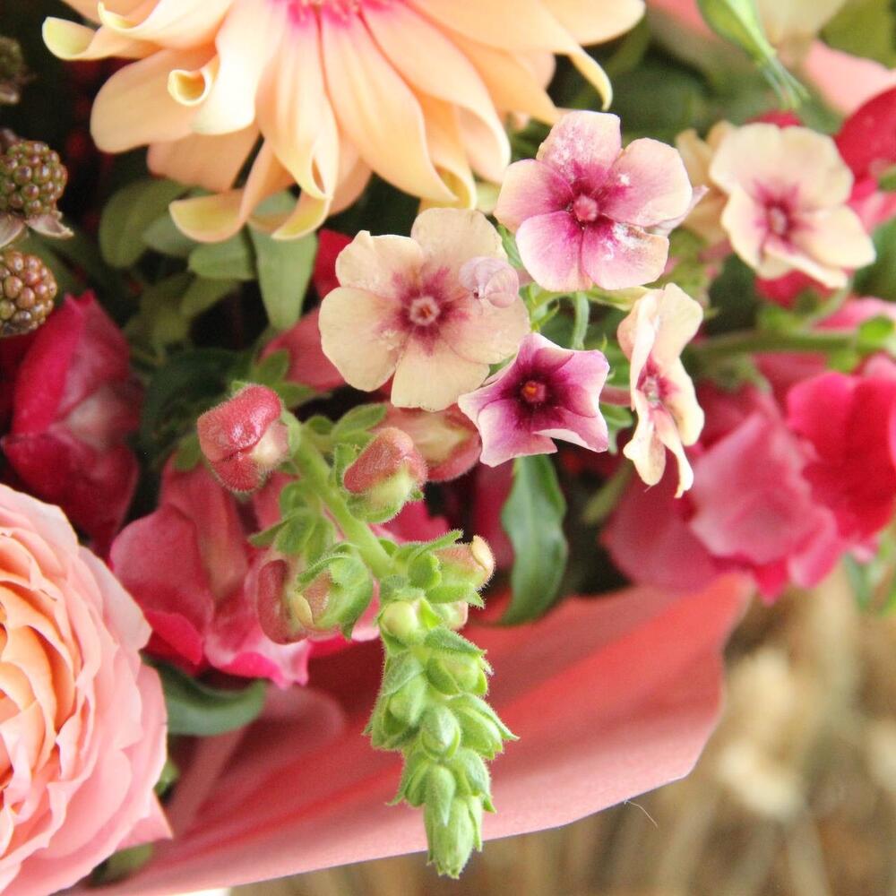 Пион – 1 шт.гербера кучерявая – 2 шт.Флокс – 2 шт.Львиный зев – 2 шт.Роза пионовидная – 1 шт.Ежевика – 1 шт.Маттиола – 1 шт.Лизиантус – 1 шт.Паникум – 1 шт.Ветки малины – 2 шт.Фисташка – 3 шт.Упаковка – 1 шт.Лента – 1 шт.